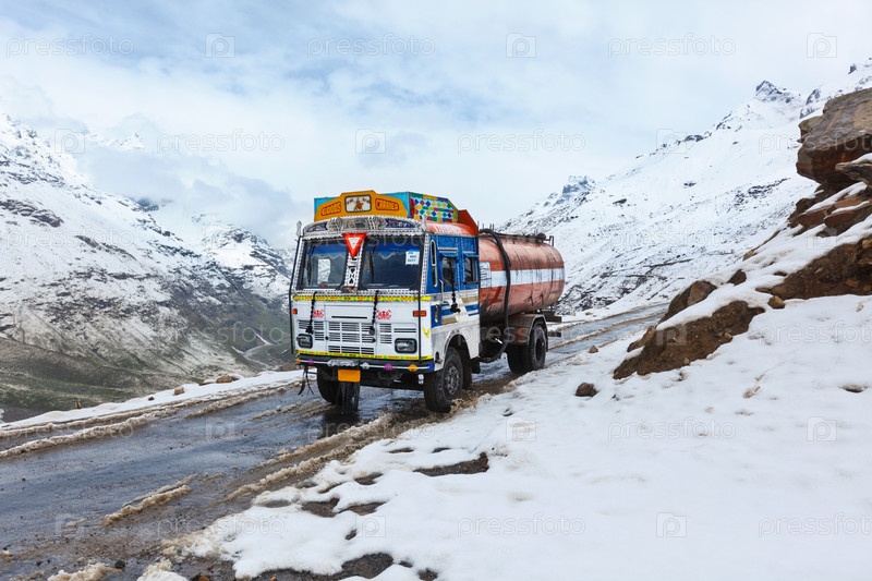 Грузовик на дороге Манали-Лех в индийских Гималаях. Химачал-Прадеш, Индия