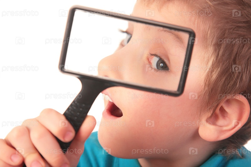 Мальчик смотрит через лупу