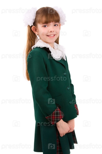 Портрет улыбающейся девочки в школьной форме на белом фоне
