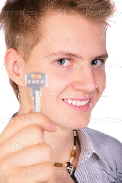 Молодой симпатичный парень держит в руке ключ от квартиры