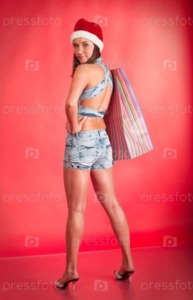 Молодая женщина в шапке Санты с пакетом на красном фоне