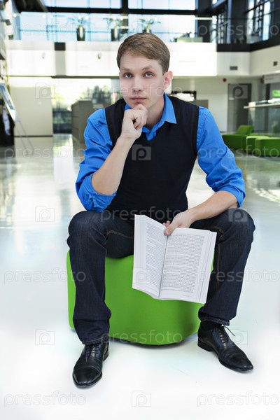 Студент сидит на стуле с открытой книгой