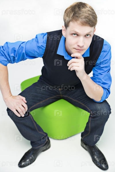 Студент сидит на зеленом шаре и размышляет