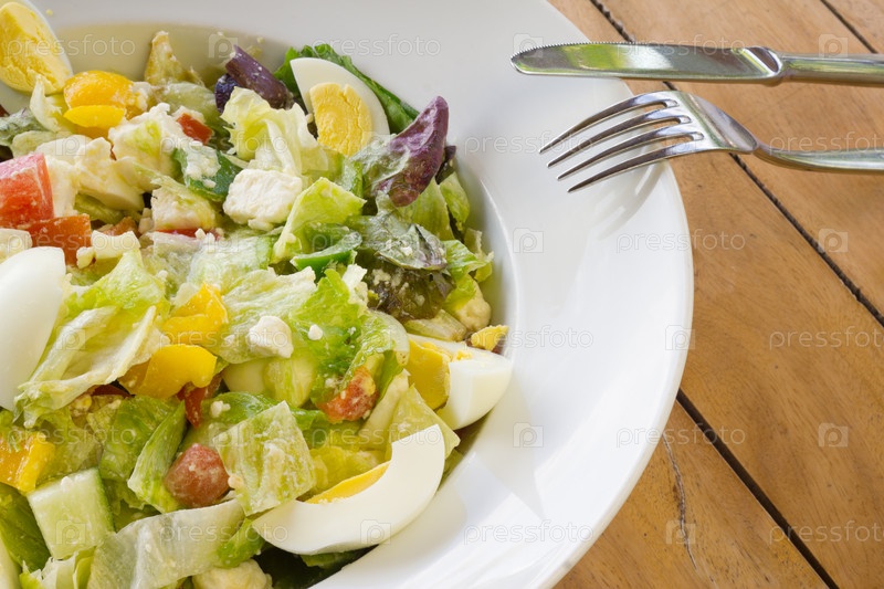 Свежий салат на круглой тарелке с вилкой и ножом