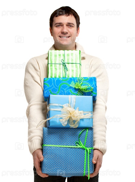 Счастливый улыбающийся молодой мужчина с подарками