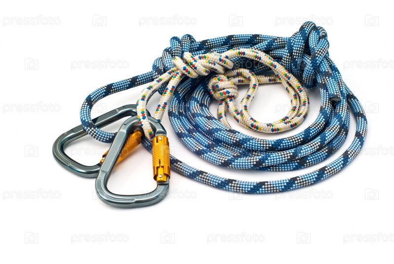 Новое альпинистское снаряжение - карабины без царапин и веревка, изолированные на белом