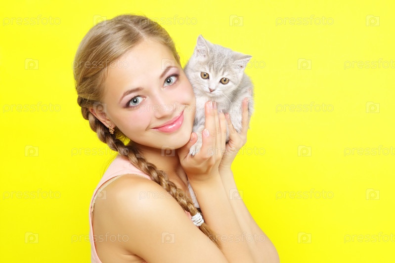 Улыбающаяся девушка с шотландским короткошерстным котенком