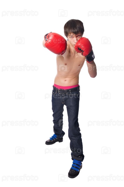 Красивый молодой человек в боксерских перчатках, изолированный на белом фоне