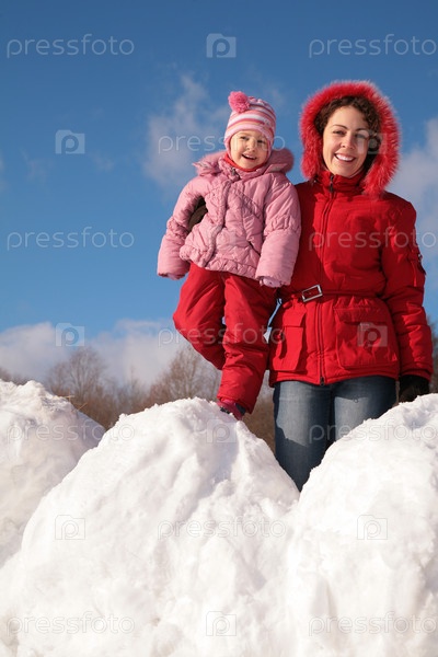 Мама и ребенок на снежном сугробе