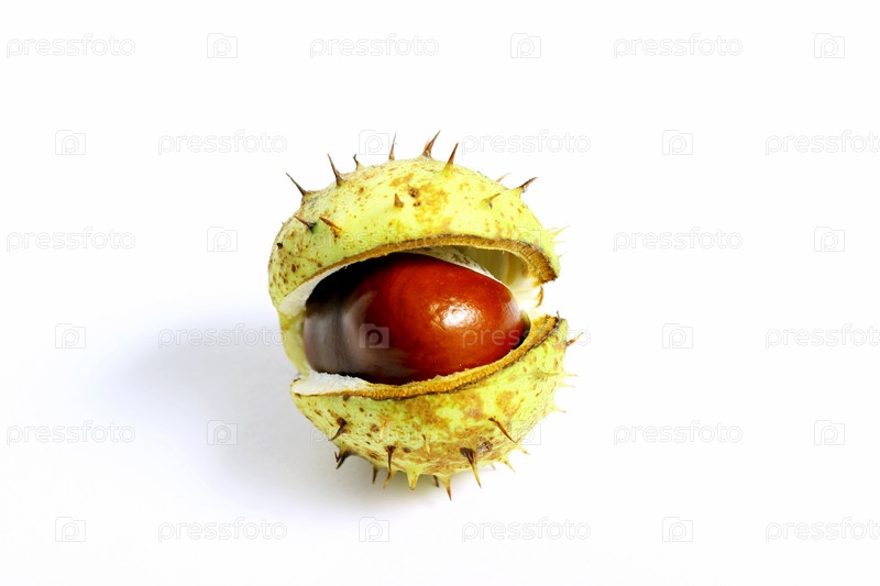 Крупным планом каштан в зеленой оболочке с шипами на белом фоне