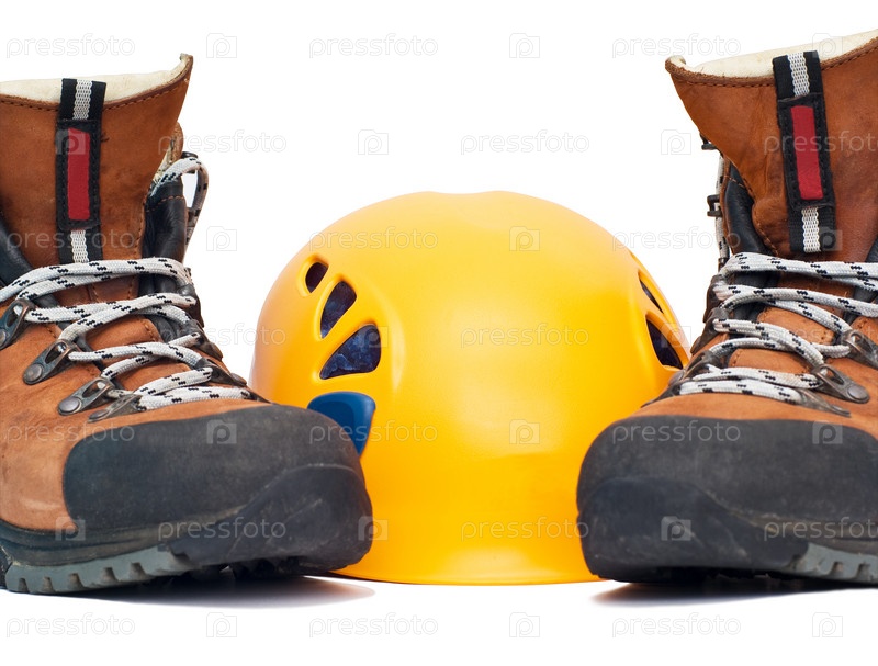 Каска и обувь для альпинизма на белом фоне