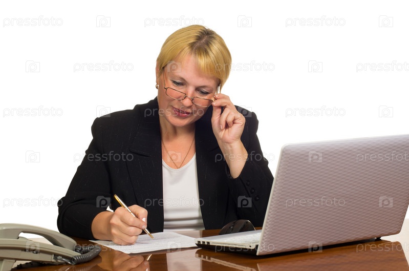 Зрелая деловая женщина пишет документ на рабочем месте