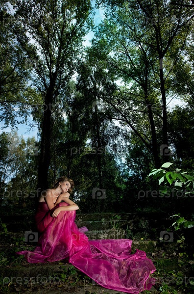 Красивая блондинка на лестнице в загадочном лесу