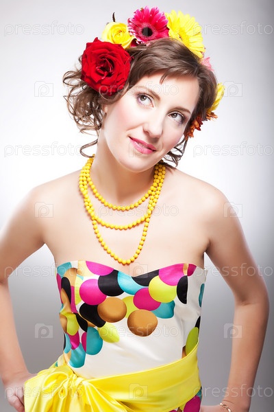 Красивое лицо - счастливая молодая милая женщина с яркими розами
