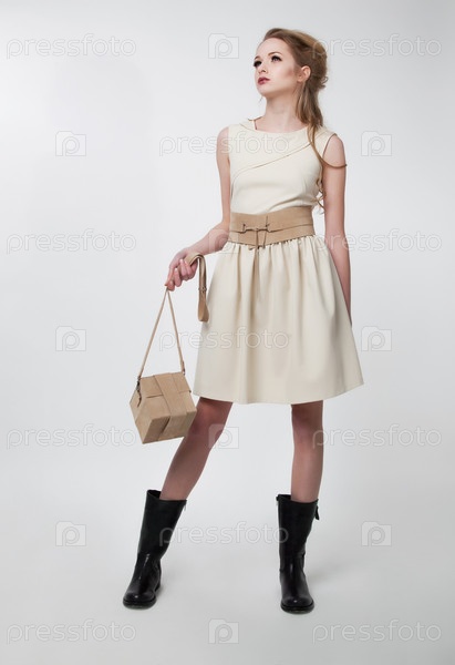 Хорошенькая девушка в современном платье с сумочкой на подиуме