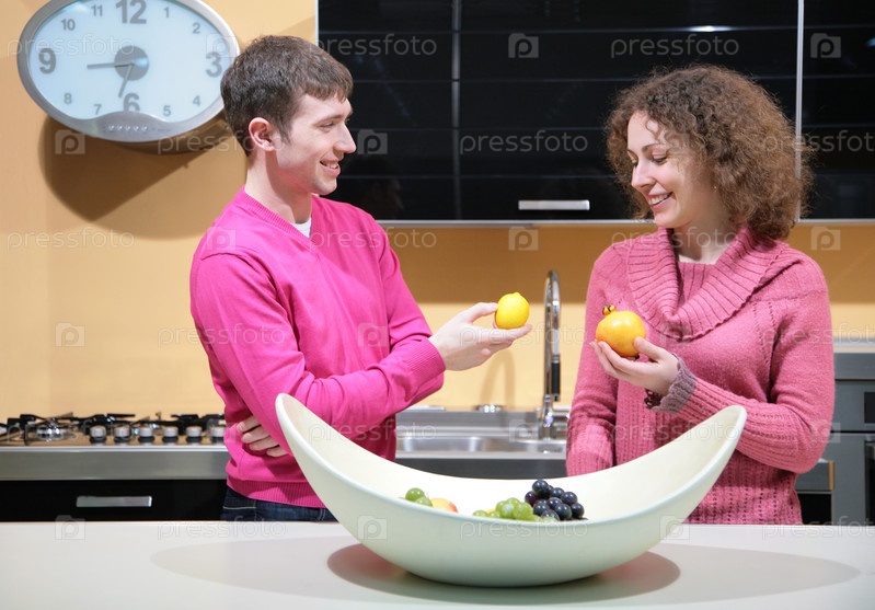 Молодая пара на кухне с фруктами в руках
