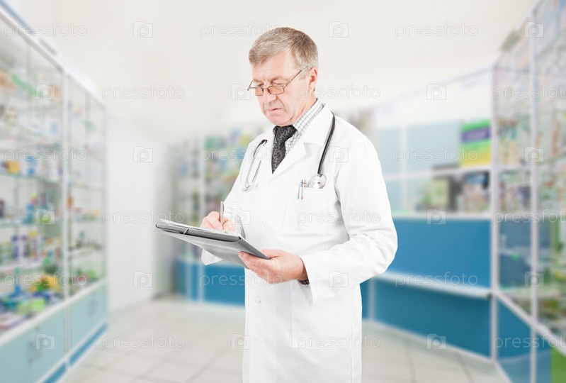 Пожилой фармацевт со стетоскопом заполняет форму в аптеке