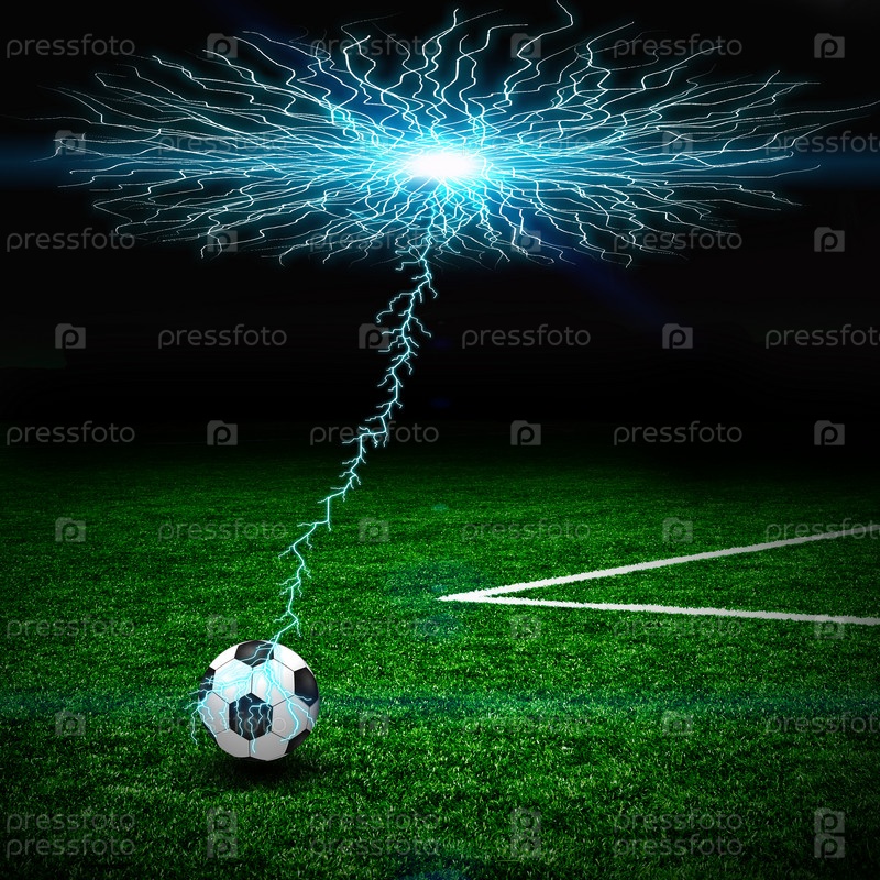 Футбольный мяч и молния на зеленом поле