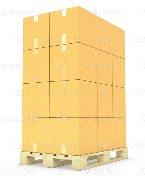 Стопка картонных коробок на поддоне, изолированные на белом фоне