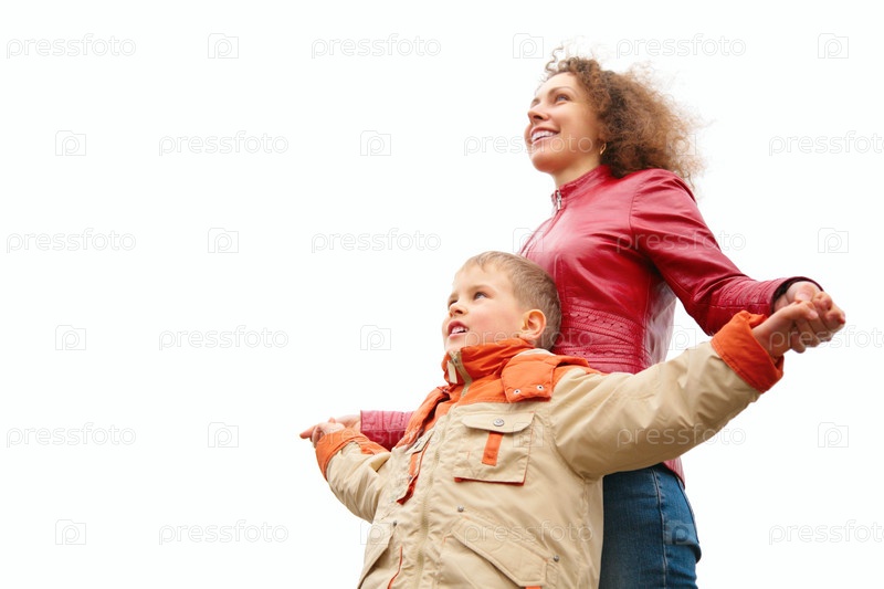 Мама и сын держатся за руки, изолированные на белом фоне