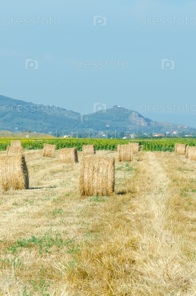 Поле с рулонами сена в летний день