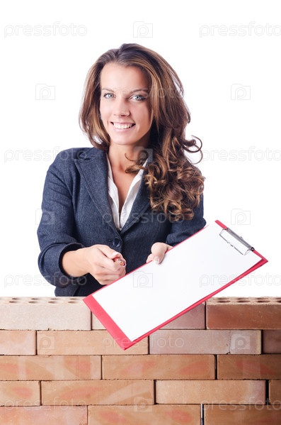 Женщина-строитель и кирпичная стена