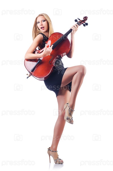 Женщина играет на виолончели на белом фоне