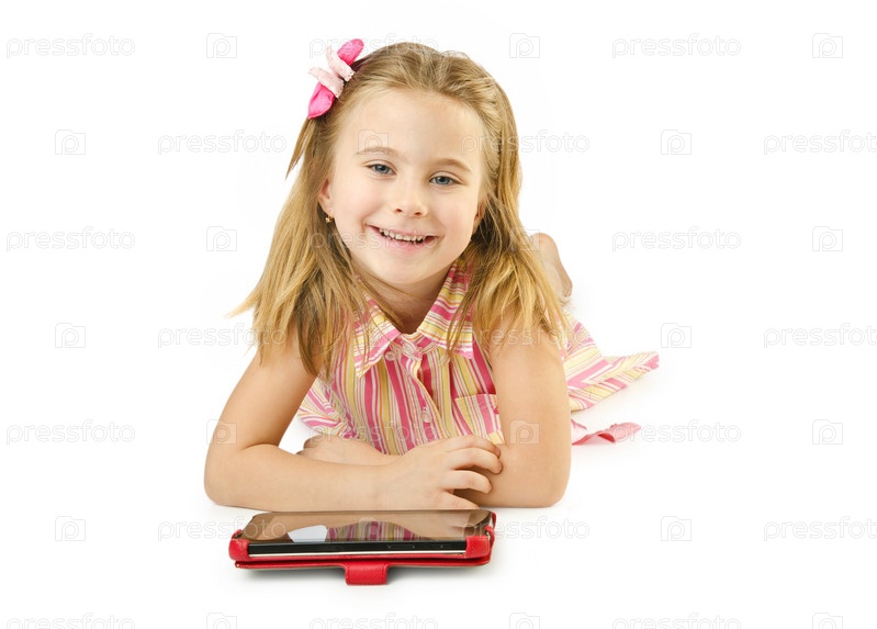 Маленькая девочка с планшетом на белом фоне
