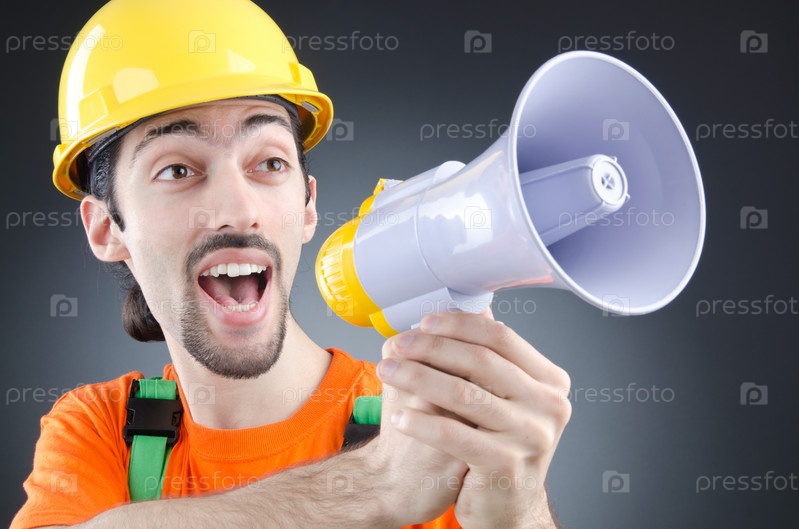 Строитель с рупором в студии