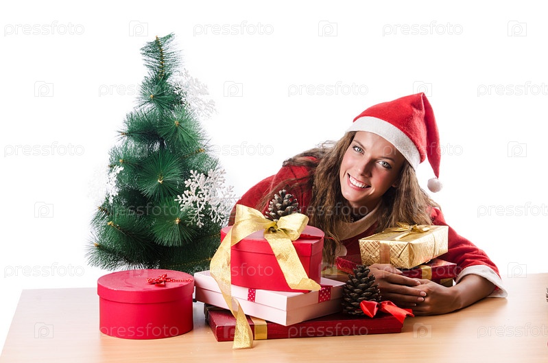 Женщина в колпаке Санта-Клауса на белом фоне
