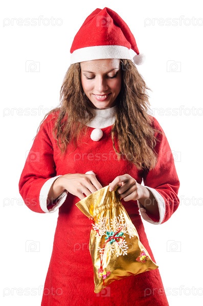 Женщина в колпаке Санта-Клауса на белом фоне