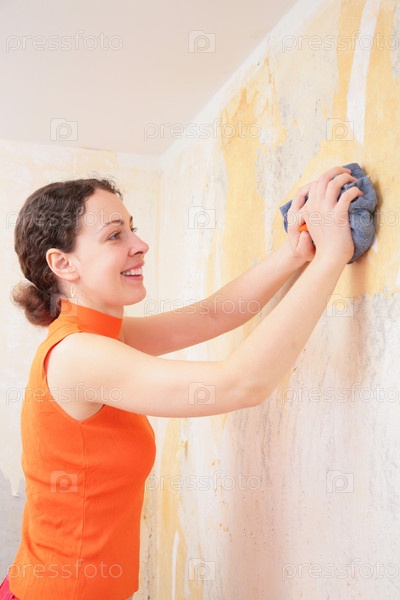 Молодая женщина удаляет старые обои