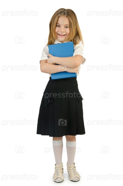 Маленькая девочка с книгами на белом фоне