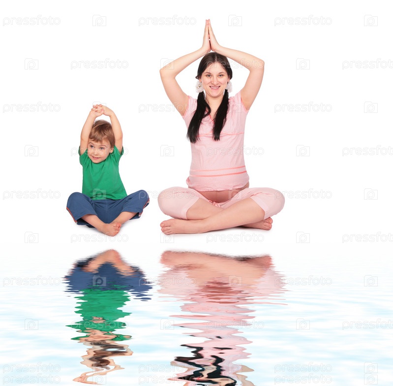 Беременная девушка с ребенком занимаются йогой, изолированные на белом фоне