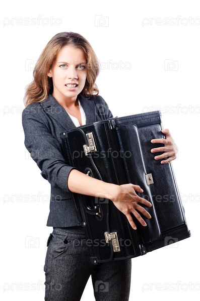 Бизнес-леди с чемоданом на белом фоне