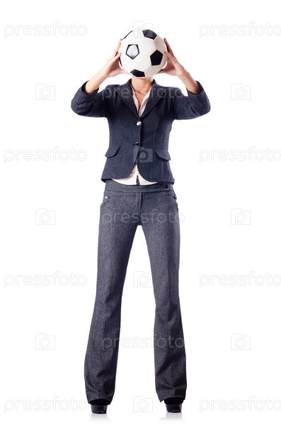 Бизнес-леди с футбольным мячом на белом фоне