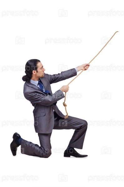 Бизнесмен тянет веревку на белом фоне