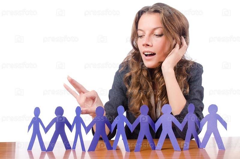 Деловая женщина с бумажными людьми на белом фоне