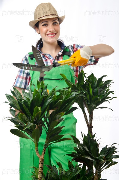 Девушка, поливающая растения на белом фоне