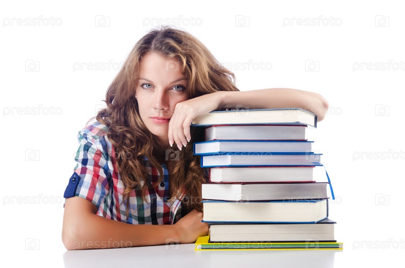 Студент с большим количеством книг на белом фоне