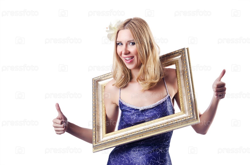 Женщина с фоторамками на белом фоне