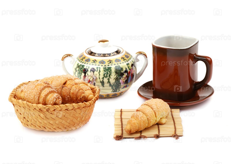 Круассаны золотистого цвета с чаем на завтрак