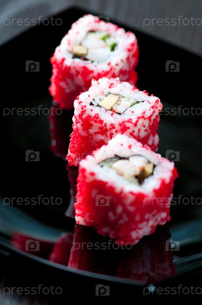 Роллы Калифорния на черной тарелке крупным планом