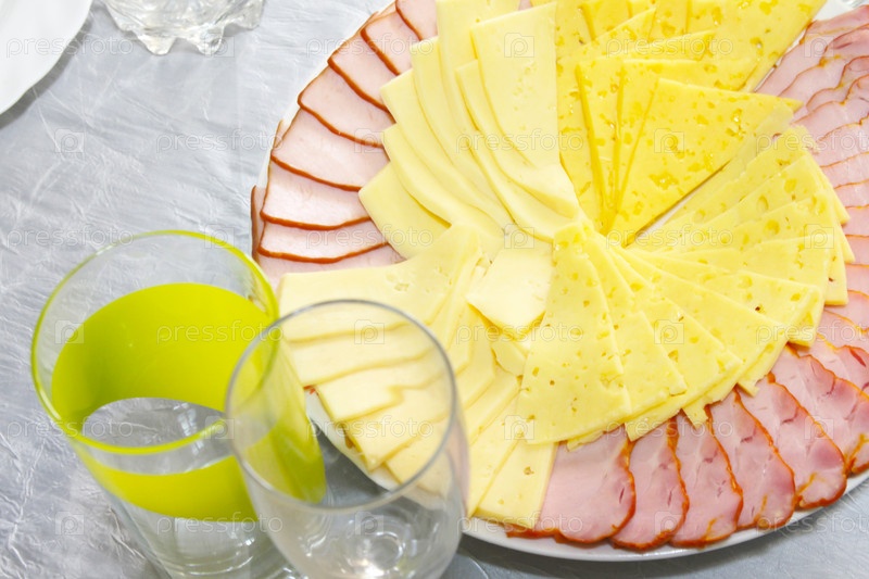 Ломтики сыра и кусок грудинки как часть праздничного меню