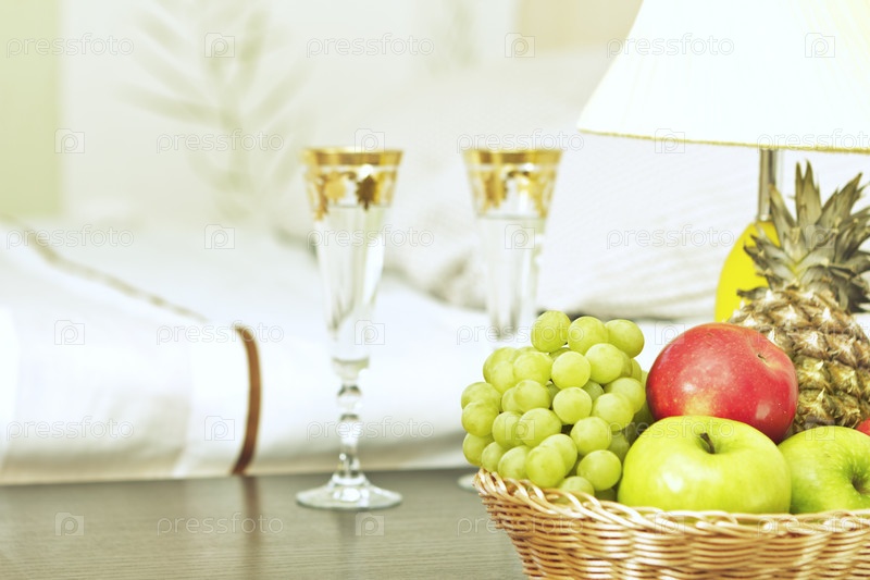 Фрукты и бокалы на столе в интерьере