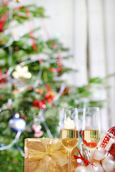 Бокалы шампанского и рождественские украшения