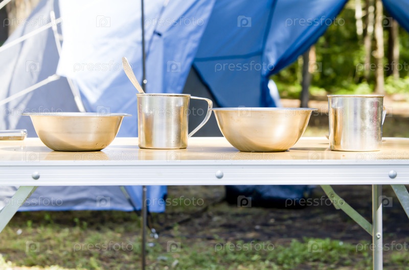 Туристическая посуда вблизи палатки
