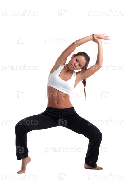 Совершенная женщина в фитнес-костюме на белом фоне