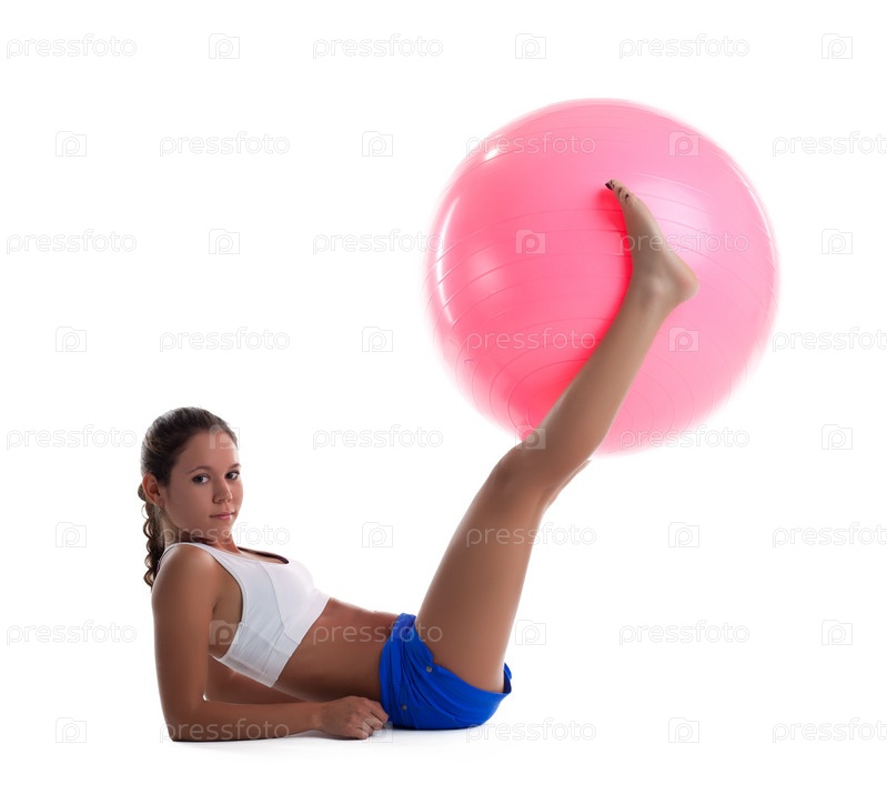 Женщина поднимает фитбол ногами, изолировано