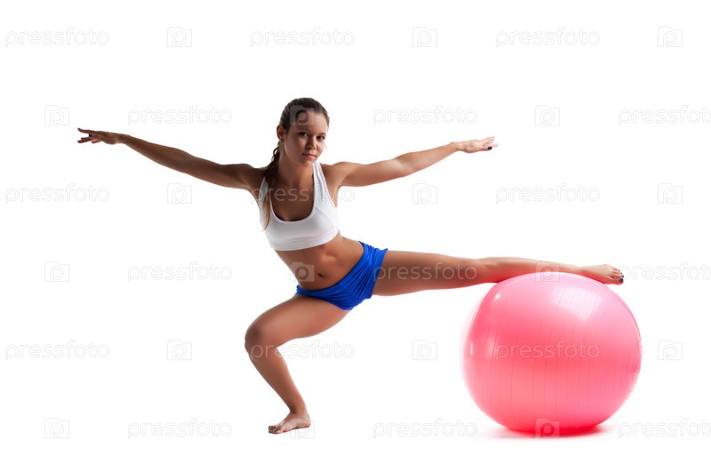 Молодая женщина делает шпагат с фитнесболом, изолированная на белом фоне